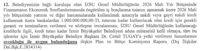 İZSU'DA 1 MİLYAR TL'LİK KREDİ BORÇLANMASI!Meclis gündeminde öne çıkan bir diğer madde ise İZSU’nun 2026 yılı bütçesi kapsamındaki yatırım ve harcamalarında kullanılmak üzere 1 milyar TL’lik kredi borçlanması oldu. İzmir Büyükşehir Belediyesi’nin kefil olacağı borçlanma süreci için Başkan Cemil Tugay’a yetki verilmesini içeren önerge, mecliste oy çokluğu ile kabul edildi.İlgili önerge şu şekilde: