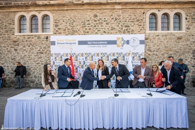 İzmir Büyükşehir Belediye Başkanı Tunç Soyer, İkinci Yüzyılın İktisat Kongresi kapsamındaki İşçi Buluşması ile eş zamanlı olarak işçileri sevindiren iki protokole imza attı. 11 bin İZENERJİ personelini ilgilendiren “Maaş Ödeme Protokolü”nde en yüksek teklifi veren İş Bankası ile sözleşme yapıldı. Anlaşmaya göre 3 yıllık protokol karşılığı kişi başı 24 bin TL promosyon ödenecek. Törende ayrıca İZFAŞ’ın 192 personelini ilgilendiren toplu sözleşmesi protokolü de imzalandı.