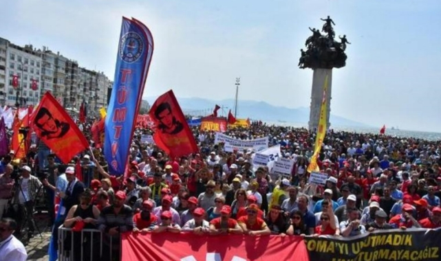 DİSK Ege Bölge Temsilcisi Memiş Sarı, Konak Kemeraltı girişinde, İzmir Tertip Komitesi adına açıklama gerçekleştirdi.