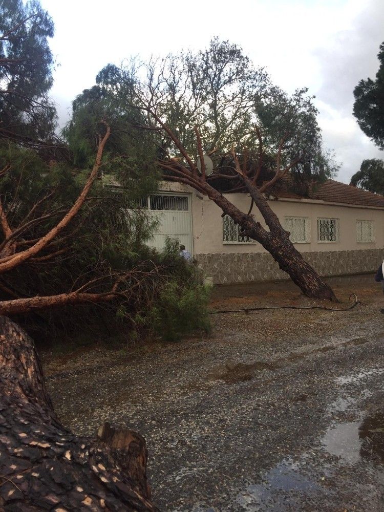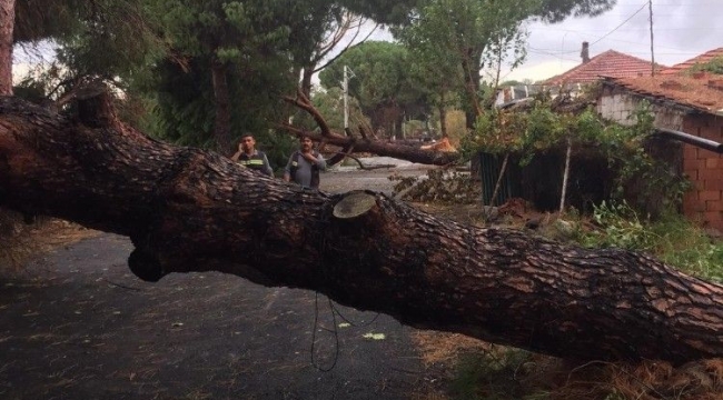 bergama Zağnos Mahallesi'nde de aşırı yağış ve fırtına, ağaçları ve elektrik direğini yerinden söktü. Yolu kaplayan ağaçlar ve elektrik direği, ekipler tarafından kaldırılmaya çalışılıyor.