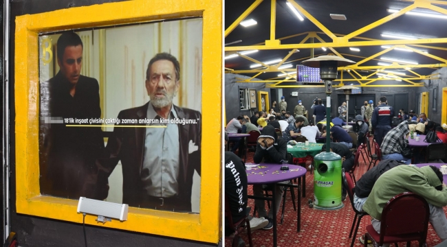 MASALARIN ALTINDA SAKLANDILAR Öte yandan, baskında senaryosunu Şafak Sezer’in yazdığı ve yönetmenliğini yaptığı ‘Kolpaçino’ filminden alınan bazı fotoğrafların kumarhane duvarlarına asıldığı fark edildi.Filmde ‘Sabri abi’ rolündeki Aydemir Akbaş’ın resminin asıldığı duvarda, altında argo kelimeler yazıldığı görüldü. Jandarma ekiplerinin daha önce de bir kumarhaneye düzenlediği operasyonda, yine sanatçı Aydemir Akbaş’ın filmindeki bir repliğinin kumarhane duvarına asılması dikkat çekmişti.