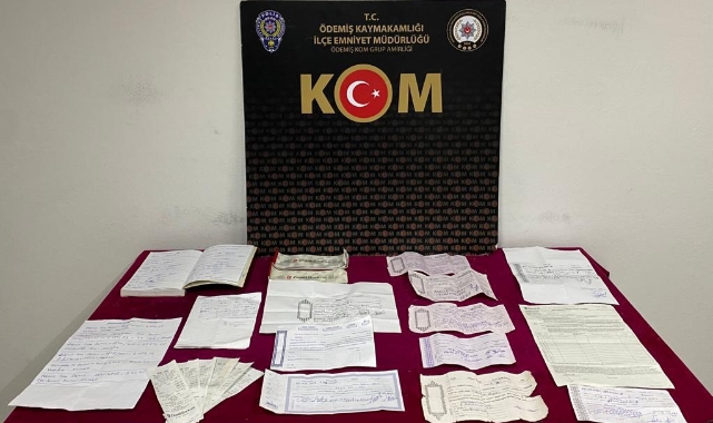 Ödemiş Cumhuriyet Başsavcılığı koordinesinde, Mali Suçlarla Mücadele Şube Müdürlüğü, Ödemiş Mali Suçlar Büro Amirliği ekiplerince gerçekleştirilen operasyonda; Tefecilik suçu kapsamında, mağdur vatandaşlara senet imzalatarak faiz karşılığında para verdikleri; müşteki ifadeleri ve banka hesap hareketlerinin incelenmesi neticesinde tespit edilen 6 şüpheli şahıs 18 Ekim günü gerçekleştirilen Operasyon ile yakalanarak gözaltına alındı.Şüphelilere ait ikamet ve iş yerinde yapılan aramalarda ise; 10 adet senet, 2 adet çek koçanı, 1 adet hesap çetelelerinin tutulduğu ajanda, 6 adet silip, 1 adet bono, 2 adet delil niteliği taşıyan not kağıdı ele geçirildi.