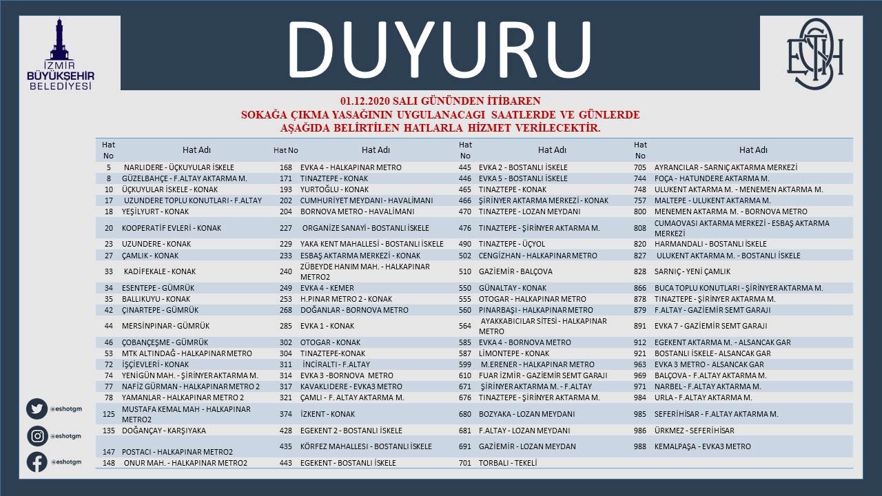 Metro, Tramvay, İZDENİZ ve İZBAN seferleriyle uyumlu olacak şekilde planlanan sefer programı, ESHOT’un resmi internet sitesinde ve akıllı telefonlara indirilebilen ESHOT Mobil uygulamasında görülebilir. İzmir Metro A.Ş. ile Konak ve Karşıyaka tramvay hatlarında cumartesi ve pazar günleri 06.00-00.20 saatleri arasında 30 dakikada bir sefer yapılıyor. İZDENİZ ve İZBAN sefer tarifelerine de her iki kuruluşun resmi internet sitelerinden ulaşılabilir.