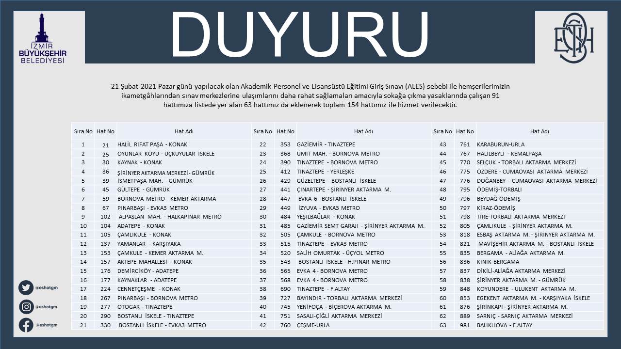 Akademik Personel ve Lisansüstü Eğitimi Giriş Sınavı (ALES) ülke genelinde 21 Şubat Pazar günü yapılacak. İzmir Büyükşehir Belediyesi ESHOT Genel Müdürlüğü, sınava girecek adayların ulaşımını kolaylaştırmak için sefer programında düzenleme yaptı. Hafta sonları sokağa çıkma kısıtlılığı uygulaması devam ettiği için 91 ana hatta hizmet veren ESHOT; ALES’e özel olarak, sınav merkezlerini içeren 63 hatta daha sefer yapacak.