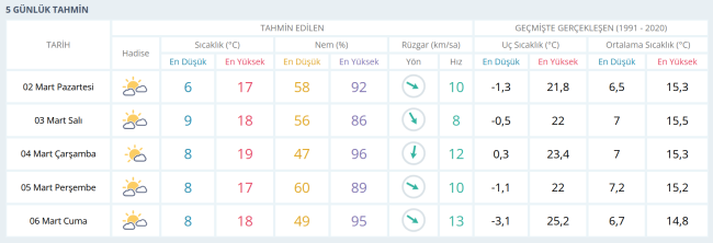 Meteoroloji Genel Müdürlüğü'nün yayımladığı verilere göre, İzmir bu haftayı parçalı bulutlu geçirecek.Sıcaklıklar ise mevsim normallerinin üzerinde seyredecek.GÜNLÜK SICAKLIKLARHavanın parçalı bulutlu geçeceği haftada sıcaklık ve nem oranları şu şekilde:2 Mart Pazartesi: En düşük sıcaklık 6°C, en yüksek sıcaklık 17°C. Nem oranı yüzde 58 - 92 aralığında.3 Mart Salı: Sıcaklık 9 - 18°C arasında. Nem oranı yüzde 56 - 86 aralığında.4 Mart Çarşamba: Sıcaklık 8 - 19°C, nem oranı yüzde 47 - 96 seviyelerinde.5 Mart Perşembe: Sıcaklık 8 - 17°C, nem oranı yüzde 60 - 89 arasında.6 Mart Cuma: Sıcaklık 8 - 18°C aralığında. Nem oranı yüzde 49 - 95 seviyelerinde.NEM VE RÜZGÂRRüzgâr hızının en yüksek 13 km/sa ile Çarşamba günü ölçüleceği tahmin ediliyor. Diğer günlerde rüzgâr hızının 8 ila 13 km/sa arasında değişeceği tahmin ediliyor.Nem oranının hafta içinde en düşük yüzde 47, en yüksek ise yüzde 96 seviyelerine ulaşması bekleniyor.