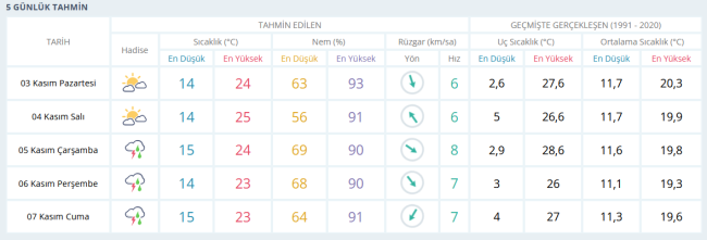 Meteoroloji Genel Müdürlüğü verilerine göre İzmir yeni haftaya parçalı bulutlu başlıyor.Haftanın ilk günlerinde hava parçalı bulutlu seyredecek, çarşamba günü ise kent genelinde gök gürültülü sağanak yağışlar etkili olacak. Sıcaklıklar mevsim normallerine yakın değerlerde kalacak.GÜNLÜK SICAKLIKLAR3 Kasım Pazartesi günü hava parçalı bulutlu olacak; sıcaklık en düşük 14, en yüksek 24 derece olarak tahmin ediliyor.4 Kasım Salı günü de parçalı bulutlu olacağı belirtilirken sıcaklıklar 17–25 derece aralığında seyredecek.5 Kasım Çarşamba günü gök gürültülü sağanak yağışlar şehirde hakim olacak; sıcaklık 15–24 derece civarında olacak.6 Kasım Perşembe günü de benzer şekilde gök gürültülü sağanak yağışlı geçecek, sıcaklık 14–23 derece aralığında ölçülecek.7 Kasım Cuma günü devam edecek olan sağanak yağışla en düşük sıcaklık 15, en yüksek sıcaklık 23 derece olacak.NEM ORANI YÜKSEK SEYREDECEK!Rüzgarın genellikle kuzey ve kuzeybatı yönlerinden 6–8 km/s hızla esmesi bekleniyor.Hafta boyunca nem oranı yüksek seyredecek; özellikle hafta başı ve ortasında %90’ın üzerine çıkması öngörülüyor.Meteoroloji tarafından paylaşın tablo şu şekilde: