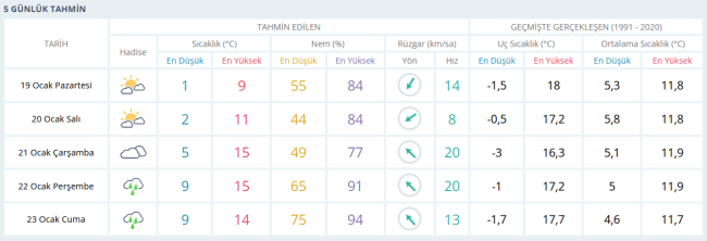 19 Ocak Pazartesi: En düşük sıcaklık 1°C, en yüksek sıcaklık 9°C. Nem oranı yüzde 55 - 85 aralığında.20 Ocak Salı: Sıcaklık 2-11°C arasında. Nem oranı yüzde 44-84 aralığında.21 Ocak Çarşamba: Sıcaklık 5-15°C, nem yüzde 49-77 seviyelerinde.22 Ocak Perşembe: Sıcaklık 9-15°C, nem oranı yüzde 65-91 arasında.23 Ocak Cuma: Sıcaklık 9-14°C aralığında. Nem oranı yüzde 75-94.NEM VE RÜZGAR