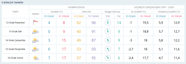 12 Ocak Pazartesi: En düşük sıcaklık 4°C, en yüksek sıcaklık 8°C. Nem oranı yüzde 62-96 aralığında.13 Ocak Salı: Sıcaklık 0-9°C arasında. Nem oranı yüzde 40-91 aralığında.14 Ocak Çarşamba: Sıcaklık 3-15°C, nem yüzde 49-87 seviyelerinde.15 Ocak Perşembe: Sıcaklık 6-17°C, nem oranı yüzde 53-93 arasında.16 Ocak Cuma: Sıcaklık 7-17°C aralığında. Nem oranı yüzde 57-95.NEM VE RÜZGAR