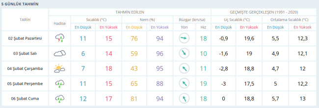 2 Şubat Pazartesi: En düşük sıcaklık 11°C, en yüksek sıcaklık 15°C. Nem oranı yüzde 76 - 94 aralığında.3 Şubat Salı: Sıcaklık 6 - 14°C arasında. Nem oranı yüzde 59 - 96 aralığında.4 Şubat Çarşamba: Sıcaklık 7 - 18°C, nem yüzde 43 - 95 seviyelerinde.5 Şubat Perşembe: Sıcaklık 11 - 15°C, nem oranı yüzde 65 - 88 arasında.6 Şubat Cuma: Sıcaklık 12 - 17°C aralığında. Nem oranı yüzde 81 - 94.NEM VE RÜZGAR