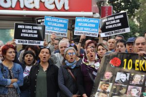 10 Ekim 2015 tarihinde Ankara Tren Gar’ı önünde düzenlenen Emek, Barış ve Demokrasi Mitingi’ne IŞİD tarafından düzenlenen bombalı katliamın üzerinden 4 yıl geçti. Katliamın yıldönümünde İzmir Emek ve Demokrasi Güçleri, yaşamını yitiren 103 kişinin anısına Türkan Saylan Kültür Merkezi önünde bir araya geldi. Anmaya katılanlar, hayatını kaybedenlerin fotoğraflarının yer aldığı pankart önünde sık sık “Faşizme karşı omuz omuza”, “Onlara sözümüz barış olacak” ve “10 Ekim’i unutma unutturma” sloganları attı. Duygusal anların yaşandığı anma etkinliğinde çok sayıda çevik kuvvet de hazır bulundu.