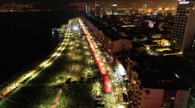 İzmir’de Cumhuriyet Bayramı kutlamaları, İzmir Büyükşehir Belediyesi tarafından düzenlenen etkinliklerle son buldu. Gece geç saatlere kadar süren ve sokaklara taşan Cumhuriyet Bayramı kutlamaları, 350 metrelik dev Türk bayrağının, Cumhuriyet Meydanı'ndan Gündoğdu Meydanı'na kadar taşınmasıyla başladı. Fener alayına ise genci yaşlısı binlerce İzmirli katıldı. Görkemli fener alayına sokaklara taşan, balkonlarına çıkan İzmirlilerin ilgisi büyük oldu. İzmir Büyükşehir Belediyesi Bandosu da çaldığı marşlarla Gündoğdu Meydanı'na kadar uzanan yürüyüşe eşlik etti.