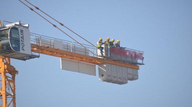 İzmir'in Konak ilçesinde, 5 aydır paralarını alamadıklarını öne süren 8 inşaat işçisi, çalıştıkları şantiyede vinçlerin üzerine çıktı. İşçilerin vinç üzerindeki eylemi sürüyor.