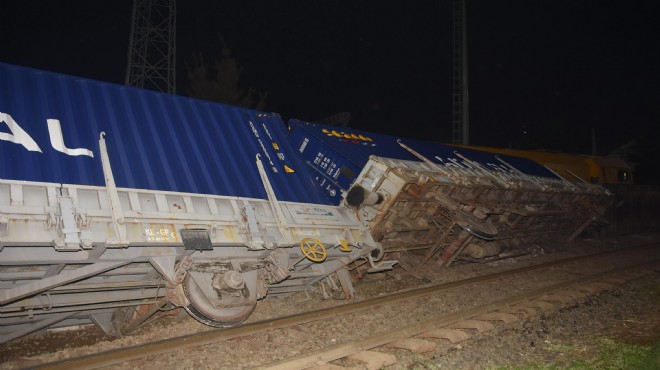 İzmir'in Konak ilçesinde, mermer ve granit yüklü konteynerlerin bulunduğu yük treni devrildi, ölen ya da yaralanan olmadı.