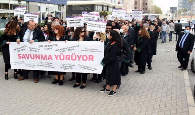 'Hukuk fakültesi sayısı azaltılsın', 'Avukatlara saldırıları engelleyin' yazılı dövizleri taşıyan yaklaşık 200 avukat, İzmir Adliyesi önünden yürüyüşe başladı. Çevredeki vatandaşlar da avukatlara alkışlarla destek verdi. Yürüyüş, Bölge Adliye Mahkemesi önünde son buldu.