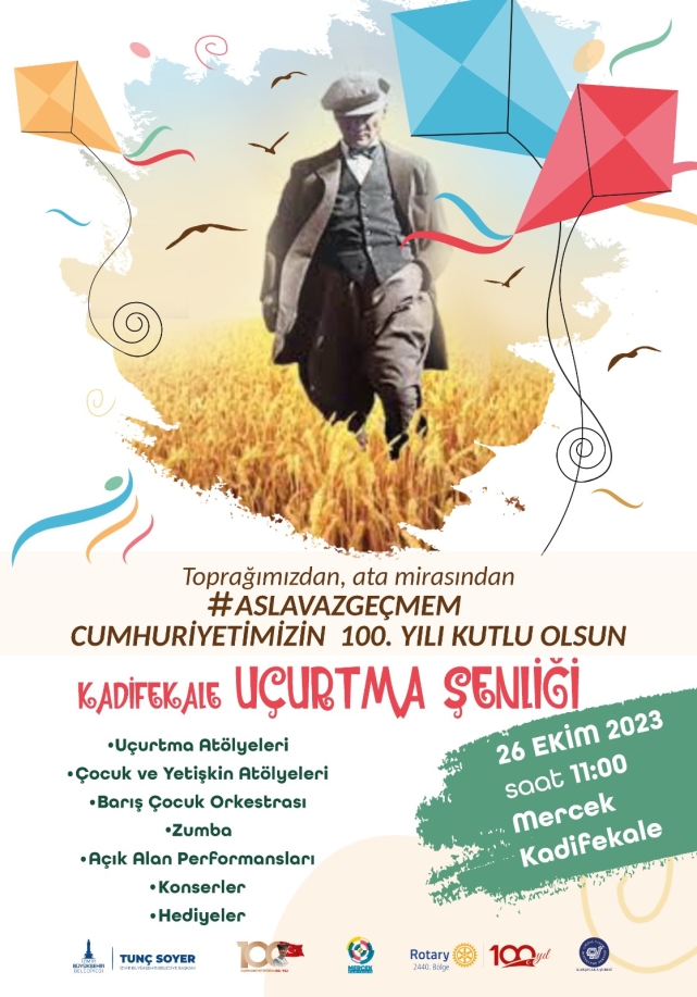 KADİFEKALE'DE GÖKYÜZÜ UÇURTMALARA SAHNE OLACAK 26 Ekim Perşembe günü saat 11.00’de Kadifekale’de Uçurtma Şenliği düzenleyecek İzmir Büyükşehir Belediyesi, gökyüzünü yüzlerce çocuğun uçurduğu uçurtmalar ile donatacak. Rotary 2440. Bölge ve Çağdaş Yaşamı Destekleme Derneği işbirliğiyle düzenlenen etkinlikte, 13.00 ile 17.00 saatleri arasında da Kadifekale Mercek’te 16 çocuk ve yetişkin atölyesi, mini konser, zumba, karaoke etkinlikleri düzenlenecek. Kadifekale Çocuk Korosu ve Barış Çocuk Orkestrası’nın seslendireceği Cumhuriyet şarkları ile çocuklar gün boyu doyasıya eğlenecek.