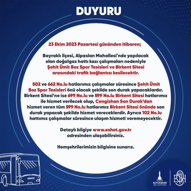 Bayraklı Alparslan Mahallesi'nden devam eden doğal gaz çalışmaları nedeniyle 502, 662, 699, 599 numaralı otobüs hatlarında değişikliğe gidilirken, çalışma boyunca 102 numaralı otobüs hattı hizmet vermeyecektir. Düzenlemenin ne kadar süreceği hakkında henüz bir bilgi verilmedi.