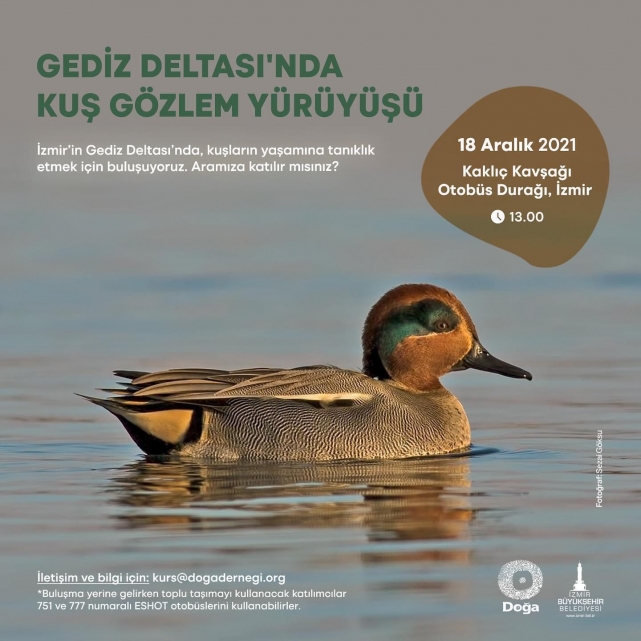 Kuş Gözlem Yürüyüşü etkinliğinde Doğa Derneği ekibi gediz deltası hakkında bilgilendirme yapacak. Ardından kuşlar ve Gediz Deltası’ndaki yaşam teleskop ve dürbünler yardımıyla yakından izlenecek. İletişim ve bilgi için [email protected] ziyaret edilebilir.