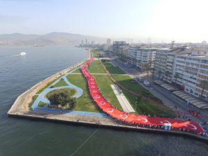 95 yıl önce işgalden kurtulan İzmir, bu anlamlı günün yıldönümünü tarihe geçecek coşkuyla kutluyor. İzmir Büyükşehir Belediyesi’nin düzenlediği 9 eylül törenleri, Basmane ile Cumhuriyet Meydanı arasındaki tarihi güzergahta gerçekleşen ve binlerce İzmirlinin katıldığı “Zafer Yürüyüşü” ile başladı. İzmirliler, İzmir Büyükşehir Belediyesi'nin hazırladığı 350’şer metre uzunluğundaki Türk Bayrağı ile Atatürk posterini taşıyarak Cumhuriyet Meydanı'na ulaştı. İzmir Büyükşehir Belediyesi’nin kentin kurtuluşunun 95. yıldönümü nedeniyle düzenlediği etkinlikler sabah 09.00’da Zafer Yürüyüşü ile başladı. Türk Ordusu’nun 9 Eylül 1922'de İzmir’e girerken kullandığı güzergâh üzerinde düzenlenen yürüyüş, Basmane Karakolu önünden başlayıp Cumhuriyet Meydanı'nda son buldu. Yürüyüş başta İzmir Büyükşehir Belediye Başkanı Aziz Kocaoğlu olmak üzere, milletvekilleri, belediye başkanları, siyasi parti il başkan ve yönetim kurulu üyeleri, sanayiciler, işadamları, sivil toplum örgütü başkanları ve halkın her kesiminden geniş bir katılımla gerçekleşti. İzmirliler, İzmir Büyükşehir Belediyesi'nin hazırladığı 350’şer metre uzunluğundaki Türk Bayrağı'nı ve Atatürk posterini taşıyarak Gaziler, Anafartalar ve İkiçeşmelik caddelerini takip ederek Cumhuriyet Meydanı'na ulaştı. Ellerinde bayraklarla halkı selamlayarak ilerleyen korteje, yürüyüşe katılamayan vatandaşlar alkışlarla, aracında olanlar ise korna çalarak destek verdi. İzmir Büyükşehir Belediyesi bandosunun marşlarla eşlik ettiği yürüyüşün ardından, Cumhuriyet Meydanı’ndaki Atatürk anıtına çelenk sunuldu.
