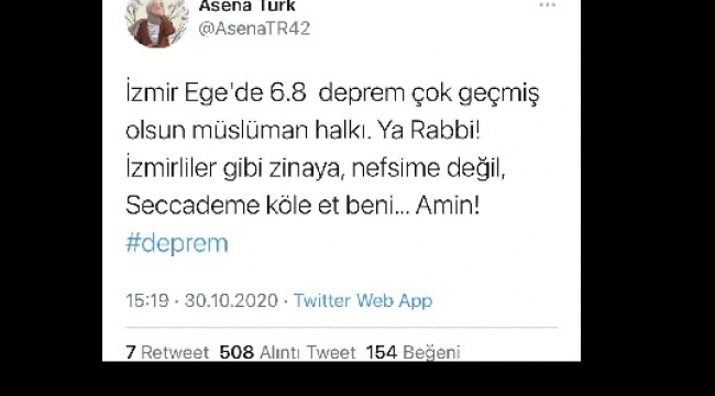Deprem sonrası bölge halkını aşağılayan şahıs "İzmir Ege'de 6.8 deprem çok geçmiş olsun müslüman halkı Ya Rabbi! İzmirliler gibi zinaya, nefsime değil, seccademe köle et beni... Amin!" paylaşımı ile büyük tepki çekmişti. (Haber 7)