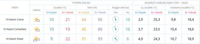 Meteoroloji Genel Müdürlüğü verilerine göre, İzmir’de hafta sonu parçalı bulutlu bir hava etkili olacak. Sıcaklıklar mevsim normallerinde seyrederken nem oranları yüksek seviyelerde olacak.15 Kasım Cumartesi günü hava parçalı bulutlu geçecek. En düşük sıcaklık 10, en yüksek sıcaklık ise 19 derece olarak kaydedilecek. Nem oranı gün boyunca yüzde 45 ile 89 arasında değişecek. Rüzgârın kuzey yönünden saatte 10 km hızla eseceği tahmin ediliyor.16 Kasım Pazar günü de kentte parçalı bulutlu bir hava hakim olacak. Sıcaklıkların 9 ile 22 derece arasında seyretmesi beklenirken nem oranı yüzde 31 ile 93 aralığında olacak. Rüzgârın kuzeydoğudan esmesi ve hızının 6 km/sa civarında olması öngörülüyor.Hafta sonunda yağış beklenmezken hissedilen sıcaklıkların her iki günde de 23 derecenin üzerine çıkması bekleniyor.Meteoroloji tarafından yayımlanan veriler şu şekilde: