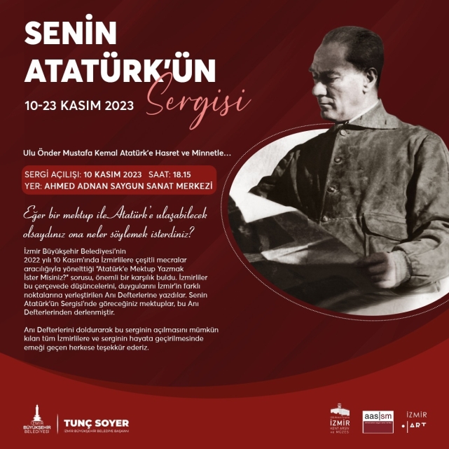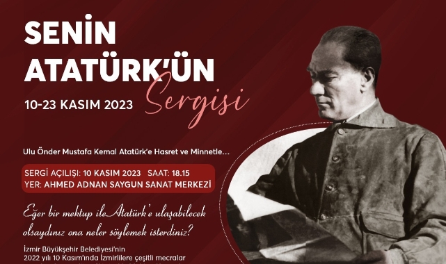 İzmir Büyükşehir Belediyesi, Ahmed Adnan Saygun Sanat Merkezi’nde İzmirlilerin Ata’sına yazdığı mektuplardan oluşan “Senin Atatürk’ün Sergisi”ne ev sahipliği yapacak. Kent Arşivi, Müzeler ve Kütüphaneler Şube Müdürlüğü’nün 2022 yılının 10 Kasım haftasında düzenlediği “Atatürk’e Mektup Yazmak İster Misiniz” etkinliğine katılan İzmirlilerin mektuplarından oluşan sergi 10 Kasım Cuma günü saat 18.15’de sanatseverlerle buluşacak. Sergi 23 Kasım tarihine kadar ziyaret edilebilecek.Anı defterinden sergiyeGeçtiğimiz yıl düzenlenen etkinlik kapsamında, İzmirlilerin Atatürk’e mektup yazabilmeleri için Konak, Alsancak, Karşıyaka, Bostanlı iskelelerine; Konak, Halkapınar, Ege Üniversitesi, Fahrettin Altay, Üçyol, Çankaya metro istasyonlarına ve Şirinyer İzban istasyonu’na anı defterleri yerleştirilmişti. Büyükşehir Belediyesi, İzmirlilerin mektuplarını bu defterlere yazmalarını sağladı. “Senin Atatürk’ün Sergisi”nde, İzmirlilerin ATA’sına yazdığı mektupların yanı sıra APİKAM arşivinden özenle seçilen Atatürk portreleri de İzmirlilerle buluşacak.