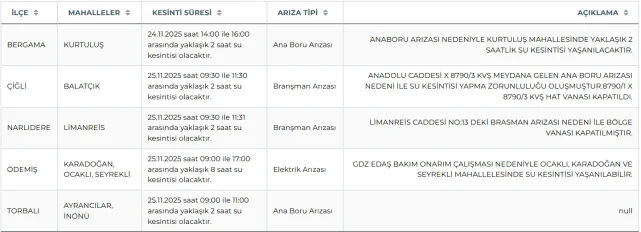 İzmir Torbalı’da ise Ayrancılar ve İnönü mahallelerinde kesinti olacak. 09.00 ve 11.00 saatleri arasında olan kesintinin ana boru arızası sebebiyle olduğu bildirildi.