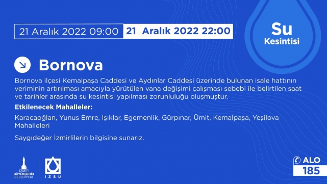 Su kesintisinden etkilenecek mahalleler, Bornova Karacaoğlan, Yunus Emre, Işıklar, Egemenlik, Gürpınar, Ümit, Kemalpaşa, Yeşilova Mahalleleri olduğunu söyleyen İZSU, İzmirli vatandaşlara önlem almaları için uyarıda bulundu.