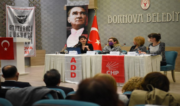 Atatürkçü Düşünce Derneği Bornova Şubesi ile CHP Bornova İlçe Başkanlığı’nın birlikte düzenlediği “Kadın Özelinde Sömürü Şiddet Emek Adalet” paneli ilgiyle izlendi. CHP Bornova Kadın Kolları Başkanı Duygu Bölük’ün moderatörlük yaptığı panelde, Psikiyatrist Yazar Uzman Dr. Arzu Erkan Yüce, Avukat Uluğ İlve Yücesoy, Akademisyen Aysun Gezen deneyimlerini paylaşarak kadın hakları mücadelesini anlattı.