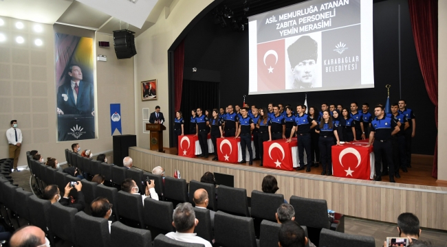 Konuşmaların ardından zabıta memurları, ellerini Türk bayraklarına koyarak ve Karabağlar Belediye Başkan Yardımcısı Aykut Kolatar tarafından okunan metni hep bir ağızdan tekrarlayarak yemin ettiler.