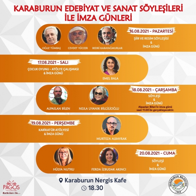 Bu yıl birbirinden değerli şair, yazar ve sanatçıların yer alacağı Karaburun Edebiyat ve Sanat Söyleşileri kapsamında 17 Ağustos Salı saat 18.30’da Emel Bala “Çocuk Oyunu-Atölye Çalışması ve İmza Günü’’, 18 Ağustos Çarşamba 18.30’da Nejla Uyanık Bilgilioğlu ve Alpaslan Bilen “Söyleşi ve İmza Günü’’ (*Alpaslan Bilen’in İmza Günü saat 11.00’da gerçekleşecektir), 19 Ağustos Perşembe saat 18.30’da Murteza Albayrak “Karikatür Atölyesi ve İmza Günü’’, 20 Ağustos Cuma saat 18.30’da Hülya Nutku ve Ferda İzbudak Akıncı “Söyleşi ve İmza Günü’’ gerçekleştirilecek.