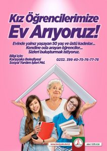 “Kız Öğrencilere Ev Arıyoruz” projesi ise üniversite eğitimi için İzmir’e gelen kız öğrencilerin barınma sorununa ekonomik ve güvenli şekilde çözüm sunmak amacıyla hayata geçirilecek. Avrupa ülkelerinde yoğun olarak tercih edilen yöntem örnek alınarak; evlerinin bir odasını kiraya vermek isteyen 50 yaş üzeri, yalnız yaşayan kadınlar ile kalacak yer arayan öğrenciler buluşturulacak. Her iki proje için de 0232 399 40 75 - 76 - 77 - 78 numaralı telefonlardan Karşıyaka Belediyesi Sosyal Yardım İşleri Müdürlüğü’ne ulaşılabilecek.