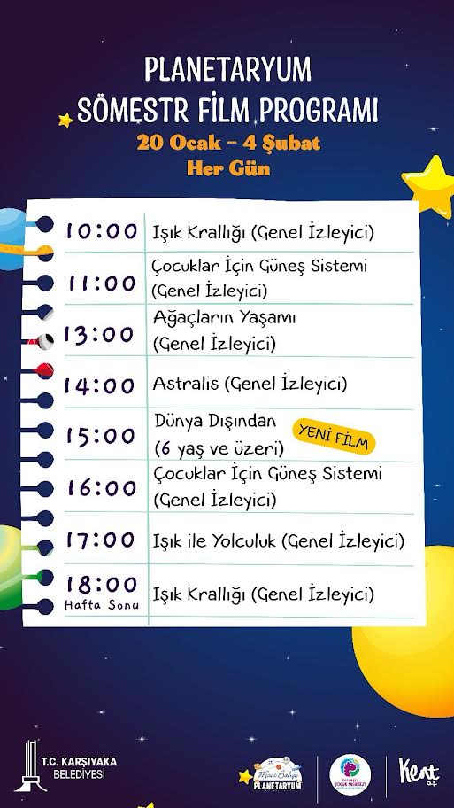 Evrensel Çocuk Merkezi Karşıyaka Eğitim Kampüsü içerisinde Eylül 2021’de hizmete açılan ve Ege Bölgesi’nin en büyüğü olma özelliği taşıyan planetaryumda da tatile özel film gösterimleri olacak. Hafta içi her gün ‘Işık Krallığı’, ‘Çocuklar İçin Güneş Sistemi’, ‘Ağaçların Yaşamı’, ‘Astralis’, ‘Işık İle Yolculuk’ ile programa yeni eklenen ‘Dünya Dışından’ filmleri gösterilecek. Hafta sonu ise fazladan bir seans olarak ‘Işık Krallığı’ isimli film izleyicileri konuk edecek. Kubbe şeklinde, 16 metre çapında bir çatıya sahip olan mekan; özgün yapısı, mimarisi, büyüklüğü, içeriği ve teknolojik özellikleriyle dikkat çekiyor. Türkiye’nin en donanımlı ve yüksek kapasiteli planetaryumları arasında yer alan tesis, 360 derece bir evren küresi içinde film izlemeye olanak sağlıyor.