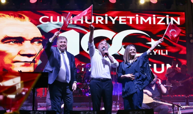 Böyle anlamlı bir gecede bir araya gelmekten mutluluk duyduğunu vurgulayan Karşıyaka Belediye Başkanı Dr. Cemil Tugay, “Cumhuriyet’imizin 100. yılını kutluyoruz; burası Karşıyaka, burası Atatürk’ü sevenlerin, Cumhuriyet’e aşık olanların kenti! Buradan öyle bir vatansever duygu çıkıyor ki Karadeniz’e, Doğu Anadolu’ya, Akdeniz’e, Türkiye’nin her yanına yeter; bu sevgi ülkemizin dört bir tarafına yayılıyor. Bununla gurur duyuyoruz. Böylesi özel bir günde, böylesi özel bir yerde Volkan Konak ile bir araya gelmek istedik. Değerli sanatçımızla birlikte Cumhuriyetimizin 100. yıl coşkusunu doruğa çıkardık. Atamızın önderliğinde, milli mücadele kahramanlarımızın kurduğu Cumhuriyetimizi, yaşatmak ve yüceltmek en önemli görevimiz” dedi. Başkan Tugay, konuşmasının ardından sanatçı Volkan Konak’a çiçek verdi. Konak da çiçeğini dinleyiciler arasında bulunan bir öğretmene takdim etti.