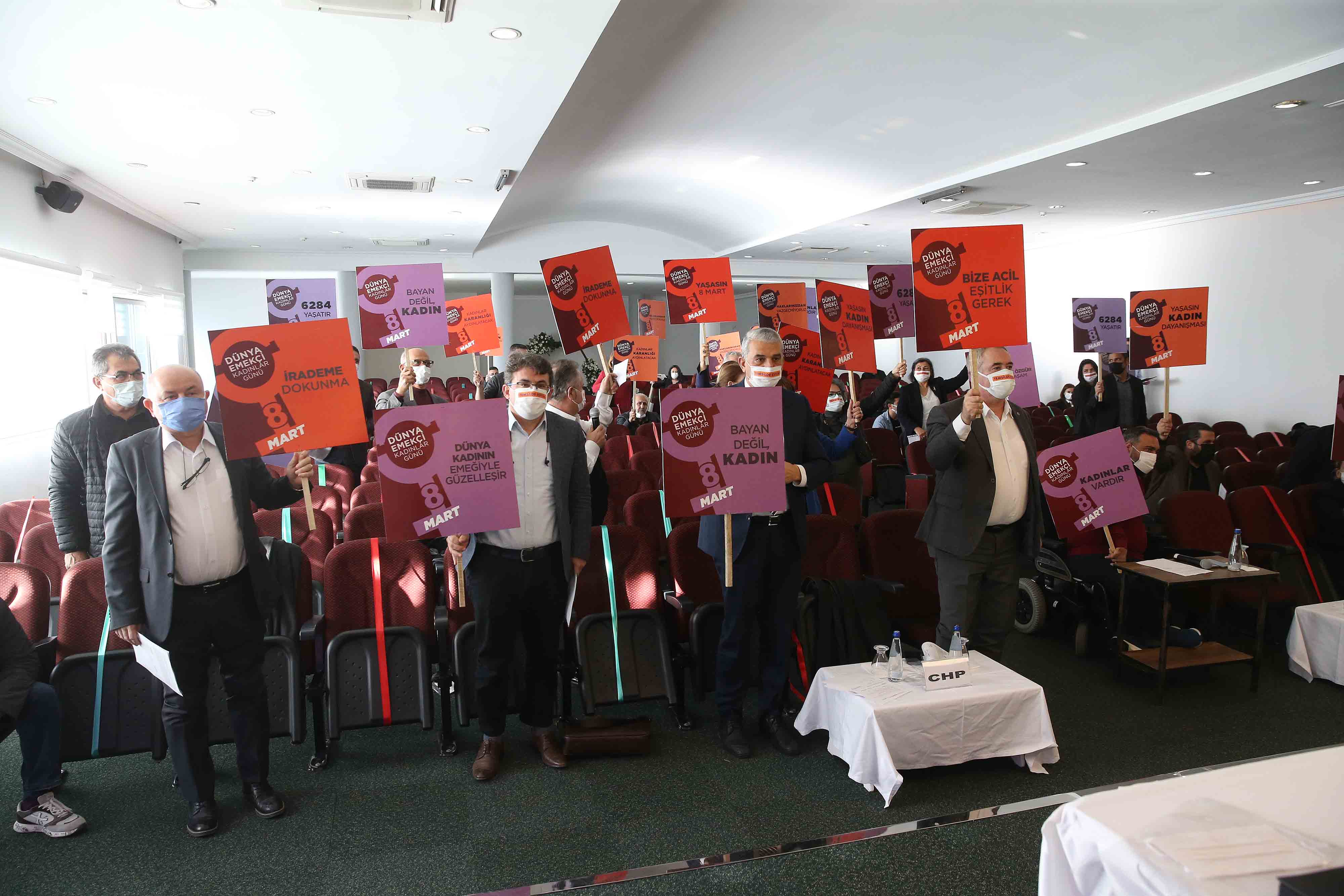 Karşıyaka Belediye Başkanı Dr. Cemil Tugay’ın başkanlık ettiği toplantıda belediye meclis üyeleri, üzerinde 8 mart Dünya Emekçi Kadınlar Günü ve toplumsal yaşamda kadın-erkek eşitliği ile ilgili sözlerin yazılı olduğu dövizleri havaya kaldırarak farkındalık yarattı.Karşıyaka Belediye Meclisi’nde olağan gündem konuları, tartışıldı komisyonlardan gelen önergeler oylamaya sunuldu.