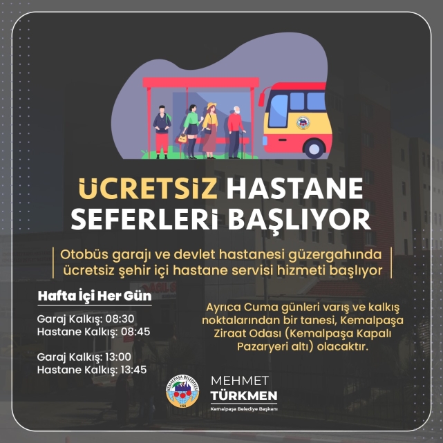 Konu ile ilgili açıklamada bulunan Kemalpaşa Belediye Başkanı Mehmet Türkmen konuşmasında, ‘Seçim sürecinde gerçekleştirdiğimiz mahalle ziyaretlerimizde bizlere iletilen önemli konulardan biri şehir içi ulaşım sorunuydu. Özellikle otobüslerin geçmediği, ilçemizin yukarı kısmında yer alan Soğukpınar ve Atatürk mahallerinde önemli bir talebe karşılık verecek seferlerimiz, otobüs garajı ve hastane güzergahında gerçekleşecek. Hafta içi her gün vatandaşlarımızın hizmetinde olacak ücretsiz şehir içi hastane seferlerimiz Kemalpaşa’mıza hayırlı olsun.’’İfadelerine yer verdi.