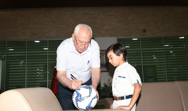 Başkan Selvitopu ziyarette küçük konuğuna imzalı futbol topu ve satranç takımı armağan etti.