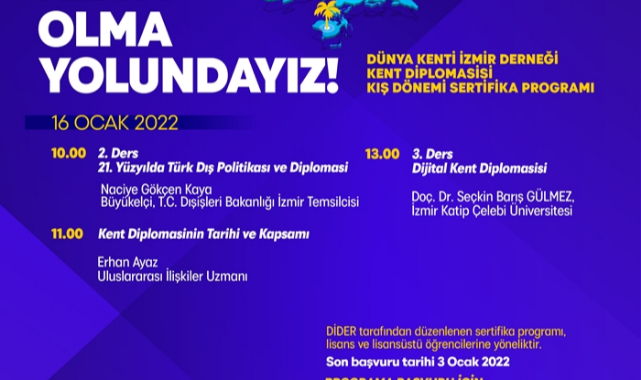 Dünya Kenti İzmir Derneği tarafından, yapılan başvurular sonucunda 50 üniversite öğrencisiyle programa başlanacağını dile getiren Dr. Güler, "Bu program her yıl iki dönem şeklinde devam edecektir. Diplomatlar, belediye başkanları, akademisyenlerin yanı sıra sanayi, iş dünyası ve medya temsilcilerinin de çeşitli oturumlarda konuşmacı olarak yer almasını planladığımız sertifika programımız, toplam 4 haftalık eğitim sonucunda üniversite öğrencilerinin kent diplomasisi alanındaki teorik bilgisini arttırmayı ve İzmir için somut projeler üretmelerini hedeflemektedir" diye konuştu.