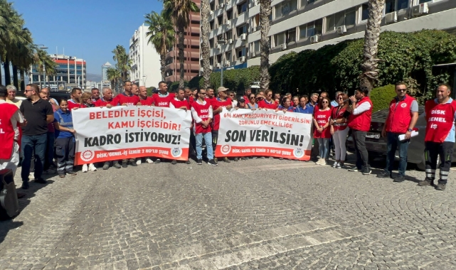 DİSK Genel-İş, kanun hükmünde kararname (KHK) ile kadro verilen işçilerin hakları için İzmir’de sokağa çıktı. İşçiler, “Kadro istiyoruz”, “Belediye işçisi kamu işçisidir” pankartları açarak “adalet” istedi.