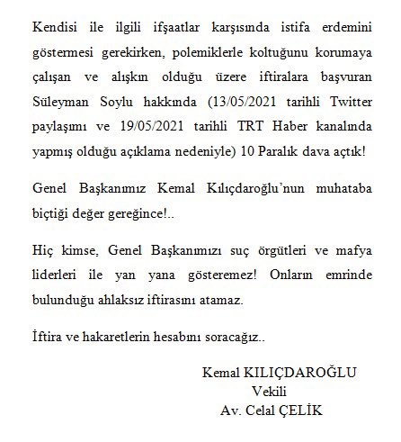 Avukat Celal Çelik yaptığı açıklamada, "Kendisi ile ilgili ifşaatlar karşısında istifa erdemini göstermesi gerekirken, polemiklerle koltuğunu korumaya çalışan ve alışkın olduğu üzere iftiralara başvuran süleyman soylu hakkında 13 Mayıs 2021 tarihli Twitter paylaşımı ve 19 Mayıs 2021 tarihli TRT Haber kanalında yapmış olduğu açıklama nedeniyle 10 paralık dava açtık! Genel Başkanımız Kemal Kılıçdaroğlu'nun muhataba biçtiği değer gereğince... Hiç kimse Genel Başkanımızı suç örgütleri ve mafya liderleri ile yan yana gösteremez! Onların emrinde olduğu ahlaksız iftirasını atamaz. İftira ve hesabını soracağız" ifadelerini belirtti.
