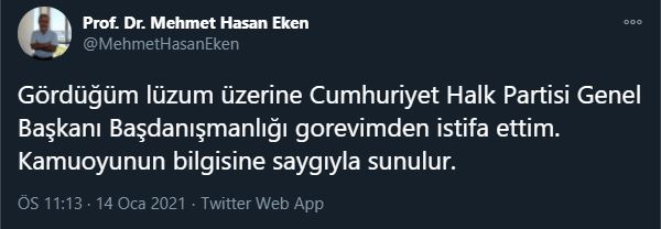 Twitter’dan açıklama yapan Eken, “Gördüğüm lüzum üzerine Cumhuriyet Halk Partisi Genel Başkanı Başdanışmanlığı gorevimden istifa ettim. Kamuoyunun bilgisine saygıyla sunulur” ifadelerini kullandı.
