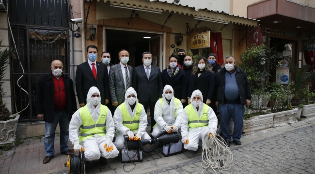 Konak Belediye Başkanı Abdül Batur, İzmir Otelciler Odası Başkanı Mehmet Gönen’in dile getirdiği otel ve pansiyon işletmecilerinin dezenfeksiyon hizmeti talepleri üzerine, ilçedeki tüm otel ve pansiyonların dezenfekte edilmesi için talimat verdi. Talimat üzerine belediyenin Temizlik İşleri Müdürlüğüne bağlı dezenfeksiyon ekipleri, Basmane’deki Oteller Sokağından başlayarak kısa zamanda ilçede talep eden tüm otel ve pansiyonlar dezenfekte etti. Otelcilerden Batur’a teşekkür geldi. “Birlikte Konak” diyerek yola çıktıklarını ve zor günleri de birlikte atlatacaklarını vurgulayan Başkan Batur, esnafın yanında olduklarını bir kez daha hatırlattı ve şunları söyledi: