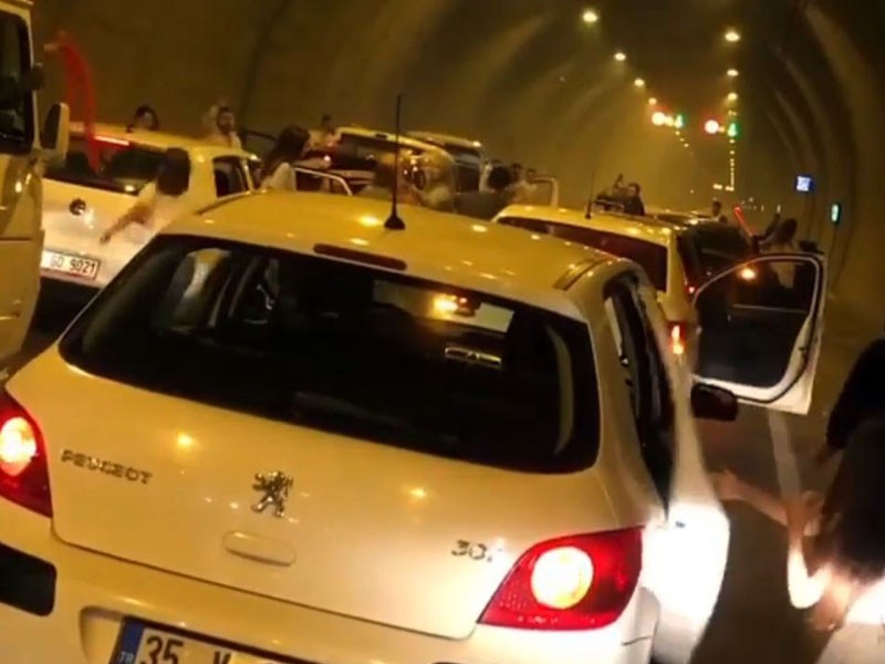 İzmir'de, düğün konvoyundaki bir grup, Konak Tüneli'nde otomobillerini durdurup, araçlarından inerek, halay çekti. Trafiği felç eden anlar, diğer sürücüler tarafından cep telefonu kameralarıyla görüntülenip, sosyal medyada paylaşıldı.