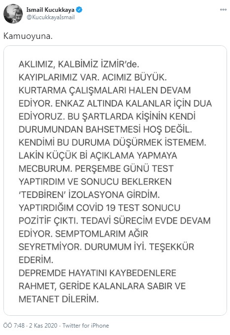 Semptomlarım ağır seyretmiyor, durumum iyi. Teşekkür ederim. Depremde hayatını kaybedenlere rahmet, geride kalanlara sabır ve metanet dilerim."