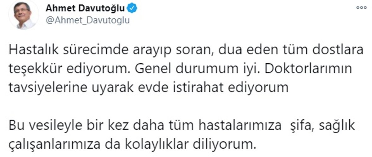 Covid-19 testi pozitif çıkan gelecek partisi Genel Başkanı Ahmet Davutoğlu, tedavisinin 2. gününde durumunun iyi olduğunu, ev karantinasını sürdürdüğünü belirtti.Sosyal medyadan paylaşımda bulunan Davutoğlu, “Hastalık sürecimde arayıp soran, dua eden tüm dostlara teşekkür ediyorum. Genel durumum iyi. Doktorlarımın tavsiyelerine uyarak evde istirahat ediyorum. Bu vesileyle bir kez daha tüm hastalarımıza şifa, sağlık çalışanlarımıza da kolaylıklar diliyorum” dedi.