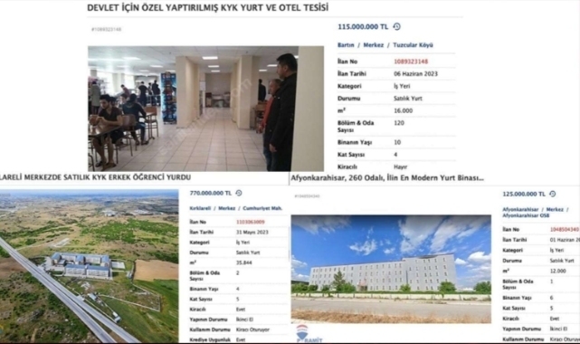 Ekonomik kriz başta olmak üzere, son yıllarda çeşitli nedenlerle üniversite eğitiminde barınma krizi sorunu yaşanırken, öğrenciler için kurulan KYK yurtlarından üçünün gayrimenkul sitesinde satışa çıkarıldığı ortaya çıktı.