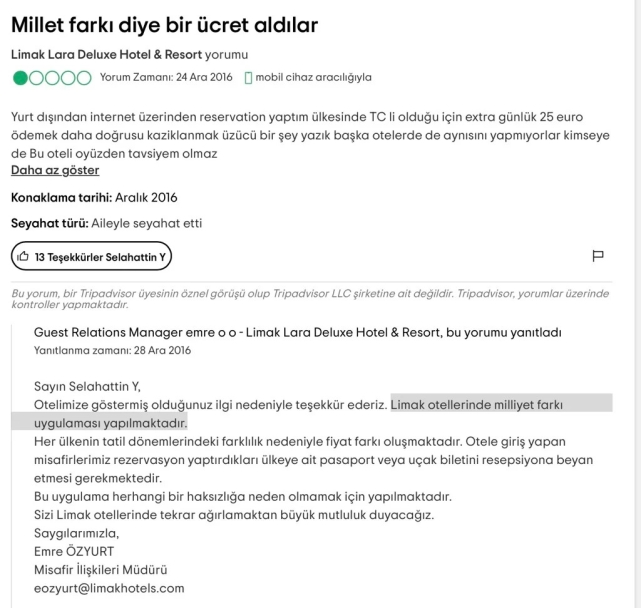 Antalya Limak Lara Hotel, İngiltere'deki bir site üzerinden rezervasyon yaptıran müşterinin Türk olduğu fark edince 120 Euro "milliyet farkı ücreti" aldığı ortaya çıkmıştı. Konuyla ilgili Kültür ve Turizm Bakanlığı'ndan yapılan açıklamada inceleme başlatıldığı belirtilerek şunlar kaydedilmişti: "Antalya'da bir otelde yaşanan ve sosyal medyada da yansıyan otel rezervasyonuna yönelik olarak Bakanlığımızca otelden resmi savunma istenmiş ve yapılacak denetim için kontrolör görevlendirilmiştir. Otelde yapılacak denetim ve incelemenin ardından yasal mevzuat gereği gerekli cezai işlem uygulanacaktır.”Skandal uygulamanın gündeme gelmesinden sonra otel de açıklama yaptı.Limak Lara Hotel, yaptığı yazılı açıklamada, "Yanlış anlaşılmalara sebep olan ‘milliyet farkı’ ifadesi nedeniyle kamuoyundan samimiyetle özür diliyoruz" denmişti. Ancak bunun ‘dikkatsizlik’ olmadığı, yıllardır süren bir şirket politikası olduğu ortaya çıktı. ‘LİMAK OTELLERİNDE MİLLET FARKI ALINMAKTADIR’X’ten paylaşılan bir değerlendirme gündeme geldi. Aralık 2016’da otelde kalan bir müşteri, kendisinden ‘fark’ alındığını belirterek, şu şikayeti yaptı: “Yurt dışında internet üzerinden rezervasyon yaptım. Ülkemde TC vatandaşı olduğum için ekstra 25 euro ödemek, daha doğrusu kazıklanmak üzücü bir şey."Otel yetkilisinin verdiği yanıtsa günümüzde yaşananların ‘bir dikkatsizlik’ olmadığı, aksine bir şirket politikası olduğunu ortaya koydu. Otelde 'milliyet farkı’ alındığı belirtilen yanıt şöyle: "Sayın Selahattin Y, otelimize göstermiş olduğunuz ilgi nedeniyle teşekkür ederiz. Limak otellerinde milliyet farkı uygulaması yapılmaktadır. Her ülkenin tatil dönemlerindeki farklılık nedeniyle fiyat farkı oluşmaktadır. Otele giriş yapan misafirlerimiz rezervasyon yaptırdıkları ülkeye ait pasaport veya uçak biletini resepsiyona beyan etmesi gerekmektedir. Bu uygulama herhangi bir haksızlığa neden olmamak için yapılmaktadır.”