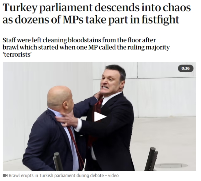 TBMM Genel Kurulu'nda Can Atalay için yapılan özel oturumda TİP Milletvekili Ahmet Şık kürsüde konuştuğu sırada AK Partili Alpay Özalan'ın Şık'a saldırması ve ardından çıkan kavga, dünya basınında geniş yer buldu. İngiltere'nin önde gelen basın kuruluşlarından The Guardian, haberi ana sayfadan verdi. Yaşananları ve süreci anlatan The Guardian, haberde şu ifadelere yer verdi:"Düzinelerce milletvekilinin yumruk yumruğa kavgaya karışmasıyla Türkiye parlamentosu kaosa sürüklendi. Bir milletvekilinin iktidar çoğunluğuna 'teröristler' demesiyle başlayan arbede sonrasında personel yerdeki kan lekelerini temizlemek zorunda kaldı."