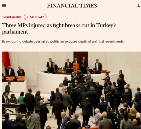 The Financial Times, Meclis'te yaşananlarla ilgili haberine "Türkiye Büyük Millet Meclisi'nde tutuklu bir milletvekili ile ilgili tartışmanın kavgaya dönüşmesi ve üç milletvekilinin yaralanması, Cumhurbaşkanı Recep Tayyip Erdoğan'ın iktidar partisinin cesaretlenen muhalefetle mücadelesinde siyasi kırgınlıkların ne kadar derin olduğunu gözler önüne serdi" ifadeleriyle başladı.31 Mart seçimlerinde AK Parti'nin "kurulmasından bu yana en ağır yenilgisini almasının ardından" Türk siyasetindeki gerilimin arttığının ifade edildiği haberde şu ifadelere yer verildi:"Mecliste yaşanan kavga, muhalefet milletvekili Ahmet Şık'ın AK Parti milletvekillerini sert bir dille eleştirerek 'haysiyetsizsiniz' demesinin ardından patlak verdi. Bunun üzerine AK Parti milletvekili Alpay Özalan, Şık'a vurarak üç milletvekilinin hafif yaralanmasına neden olan daha geniş çaplı bir çatışmanın fitilini ateşledi."