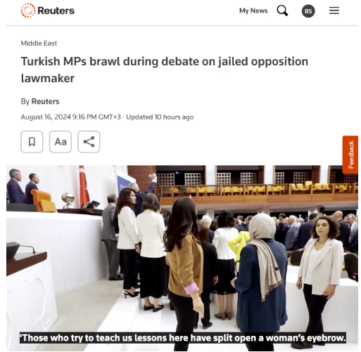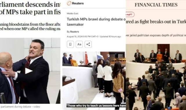 "TBMM'de bir muhalefet milletvekilinin, hükümet karşıtı protestoları organize etmek suçlamasıyla hapse atılan ancak daha sonra milletvekili seçilen meslektaşının meclise kabul edilmesini talep etmesinin ardından saldırıya uğramasıyla bir arbede yaşandı" ifadeleriyle olayı özetleyen İngiliz ajansı Reuters, "Konuşmacı kürsüsünün beyaz basamaklarına kan sıçradı" diye yazdı.Reuters haberi, "Nadir de olsa Türk parlamentosunda kavgalar duyulmamış değil. Haziran ayında AKP milletvekilleri, Türkiye'nin güneydoğusunda DEM Partili bir belediye başkanının militan bağlantıları olduğu iddiasıyla gözaltına alınması ve görevden alınması konusunda Kürt yanlısı DEM Partili milletvekilleriyle tartıştı" ifadelerine yer verdi.