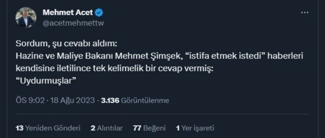 Son olarak Haber7 Yazarı Mehmet Acet, Hazine ve Maliye Bakanı Mehmet Şimşek’in istifa iddialarına ilişkin ilk tepkisini sosyal medya hesabından paylaştı.